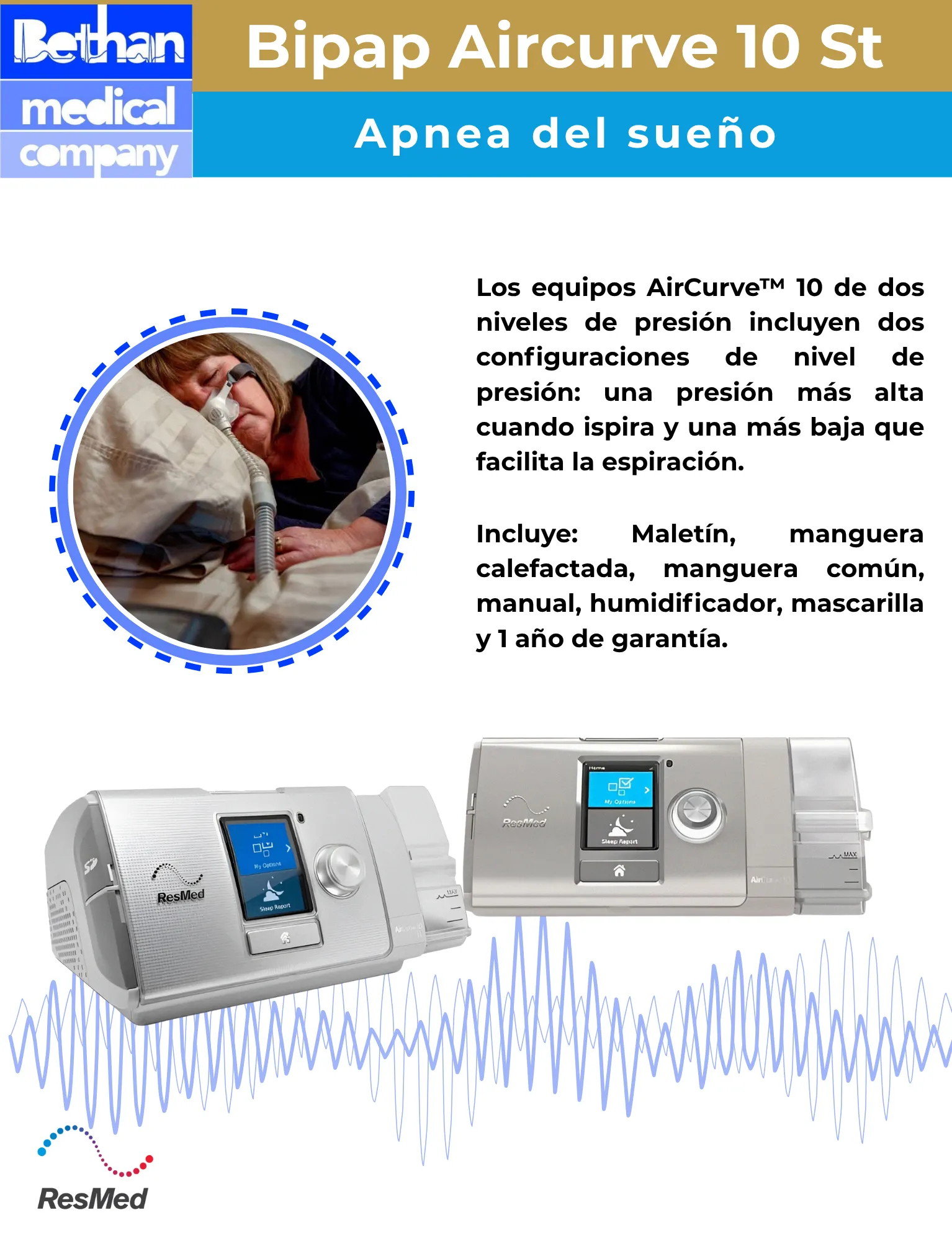 El ResMed AirCurve™ 10 ST es un dispositivo BiLevel ST (Spontaneous/Timed) diseñado para pacientes que requieren soporte respiratorio controlado. Está indicado especialmente para tratar la apnea central del sueño (CSA) y diversas condiciones neuromusculares que afectan la respiración espontánea durante la noche.