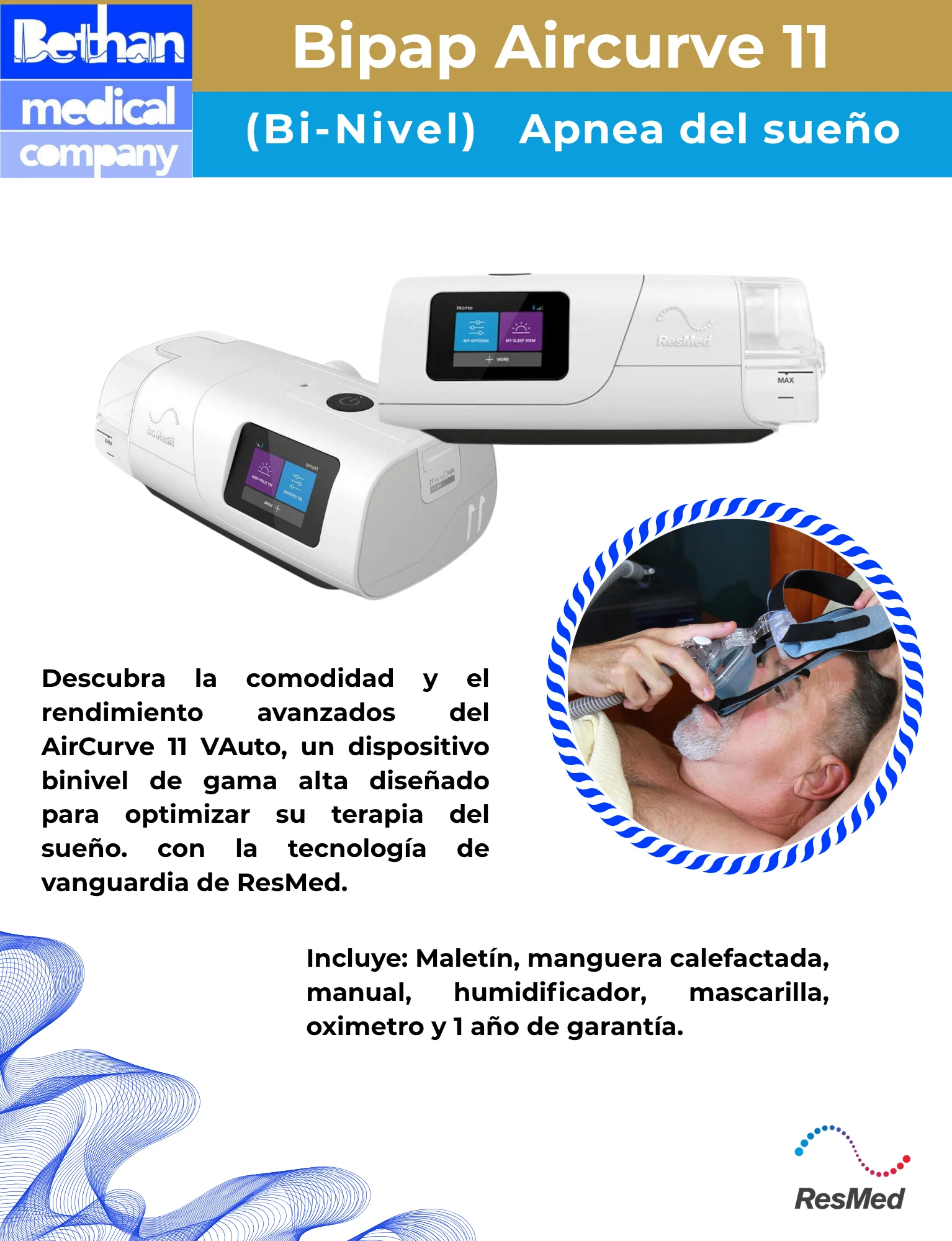 Los dispositivos AirCurve™ 11 están diseñados para usuarios de terapia que se benefician de un mayor soporte de presión. Estos dispositivos binivel incluyen dos niveles de presión: una presión más alta al inhalar y una presión más baja que facilita la exhalación.
