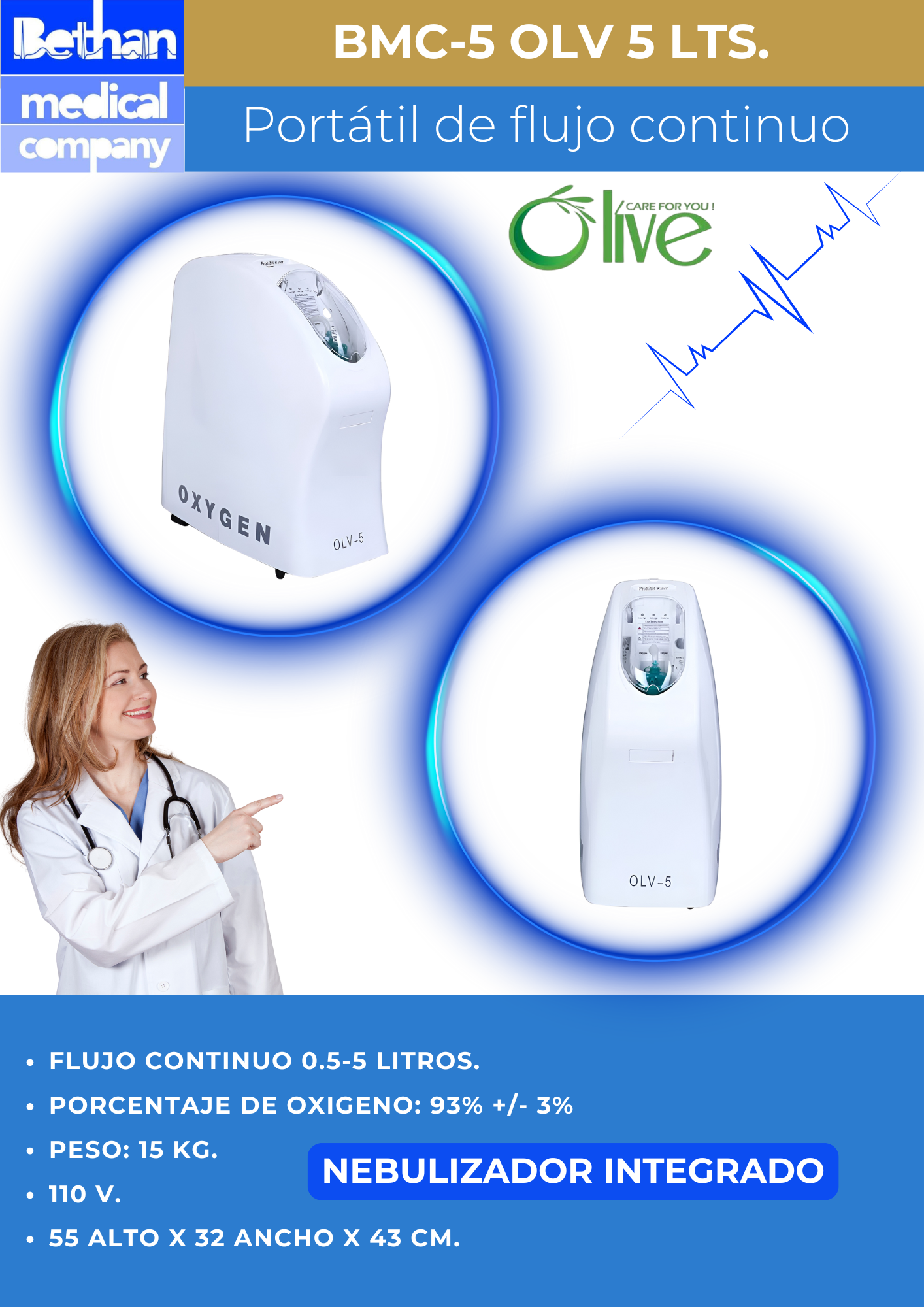 Alta pureza de oxígeno 93%±3%, 4 capas de filtros para garantizar pureza. Máxima pureza en 2 minutos. Silencioso, menos de 45db. Puede utilizarse para nebulizar medicamentos. Display lcd para desplegar horas de trabajo. 5 Litros.