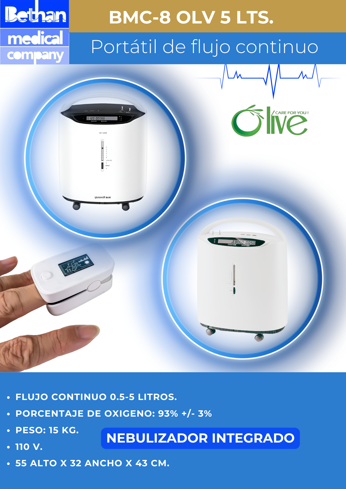 Proporciona un alto rendimiento con un diseño avanzado. Es fácil de usar de cara al paciente con su avanzada tecnología que integran en un solo equipo las funciones de concentración de oxígeno y nebulizador. Equipo silencioso, compacto y fácil de operar. Con nebulizador integrado. Fácil mantenimiento. 0.5 - 5 Lts.