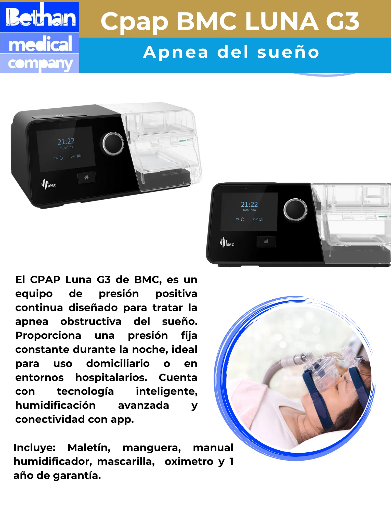 El CPAP BMC LUNA G3 es un equipo de presión positiva continua diseñado para