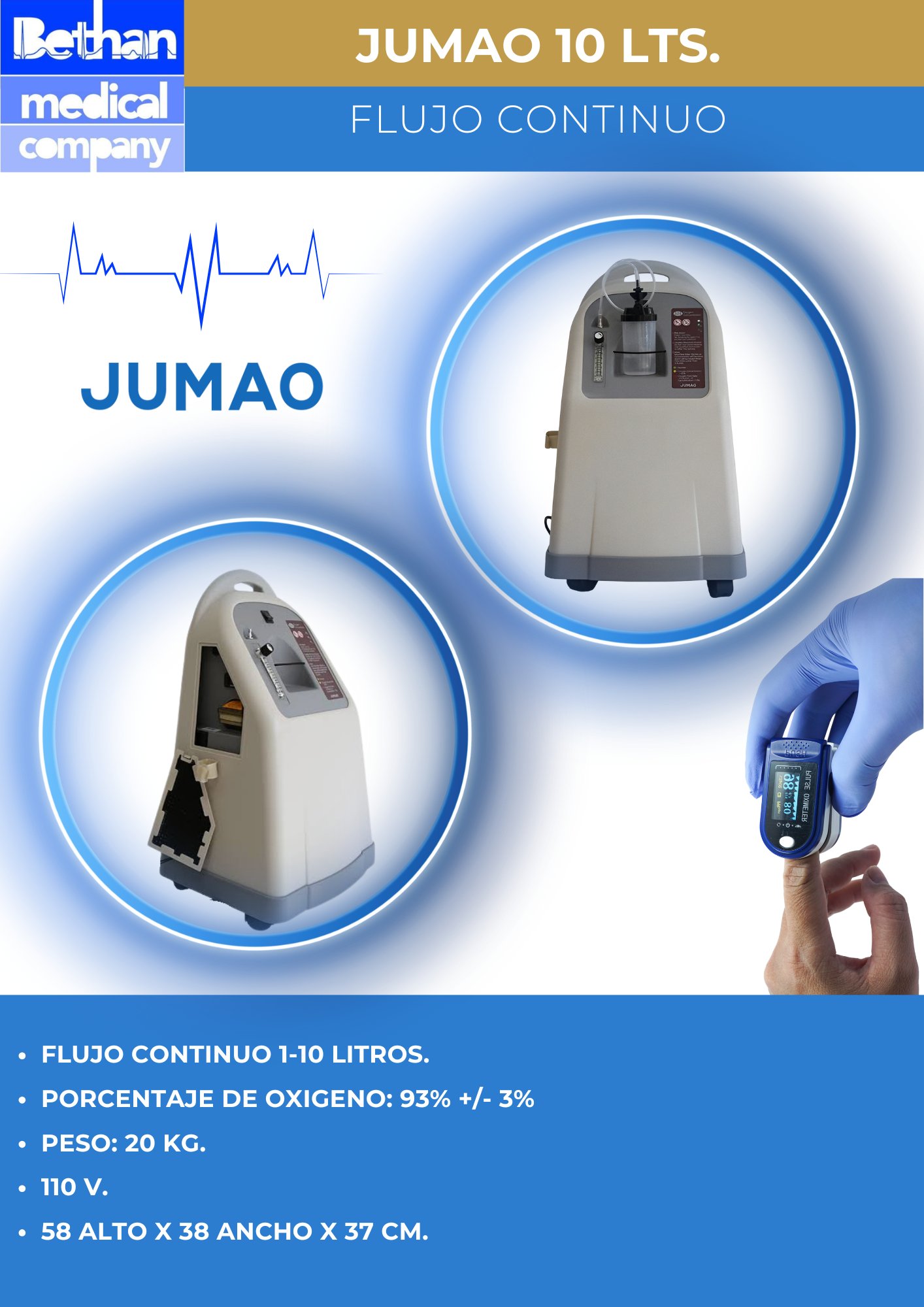 El concentrador de oxígeno JUMAO de 10Lts. es un dispositivo Grado Médico de alto rendimiento y confiabilidad. Diseñado para compensar la baja oxigenación en personas con deficiencias respiratorias o que requieran de oxigenoterapia.